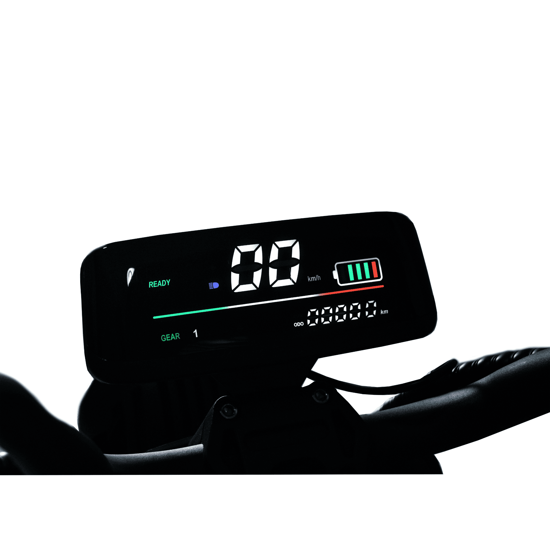 На ЖК-дисплее на данной модели отражен ряд показателей. Так, на панели представлены индикаторы готовности к поездке (READY), передачи и включенных поворотников. Представлен цифровой спидометр, а также информация об уровне заряда батареи.