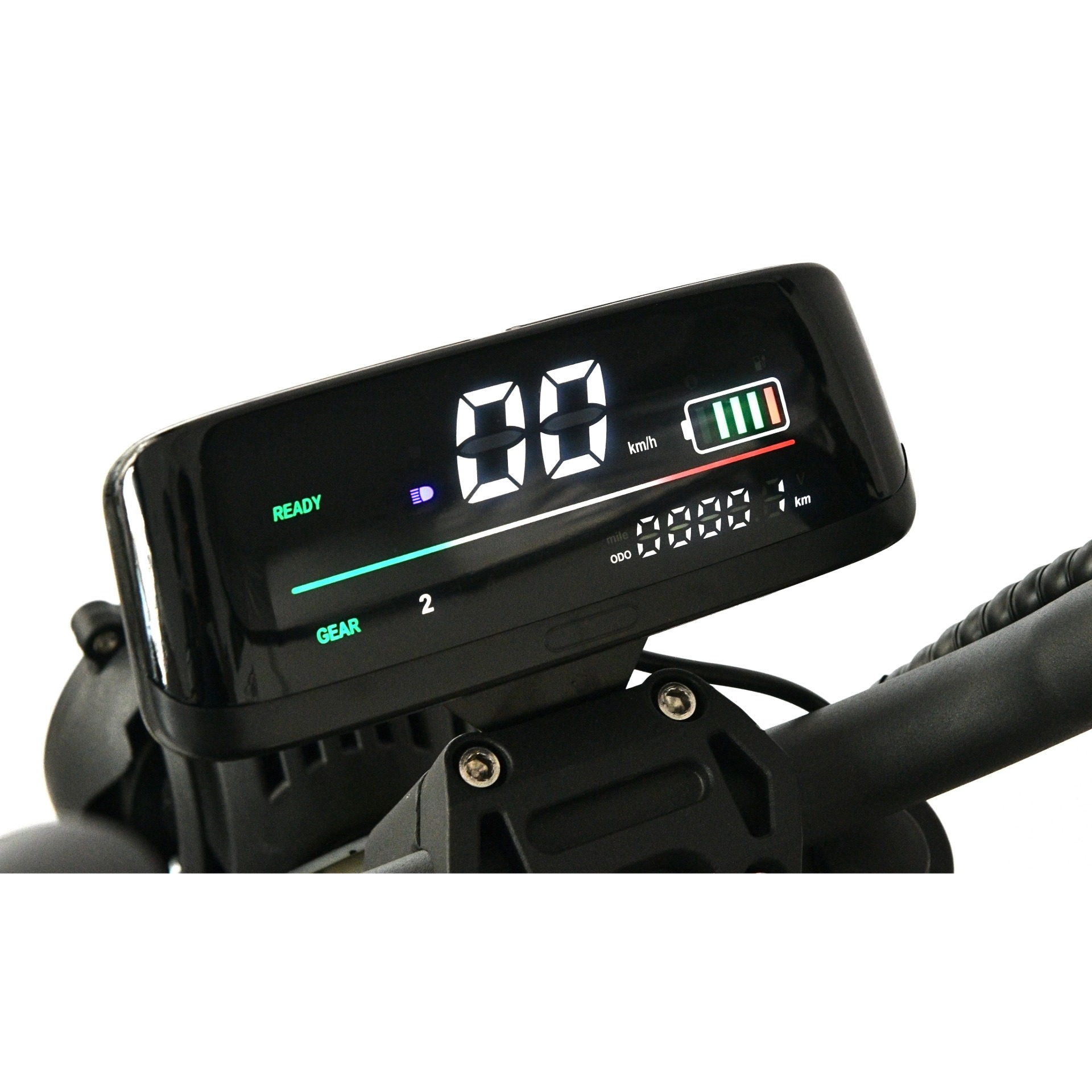На ЖК-дисплее на данной модели отражен ряд показателей. Так, на панели представлены индикаторы готовности к поездке (READY), передачи и включенных поворотников. Представлен цифровой спидометр, а также информация об уровне заряда батареи.